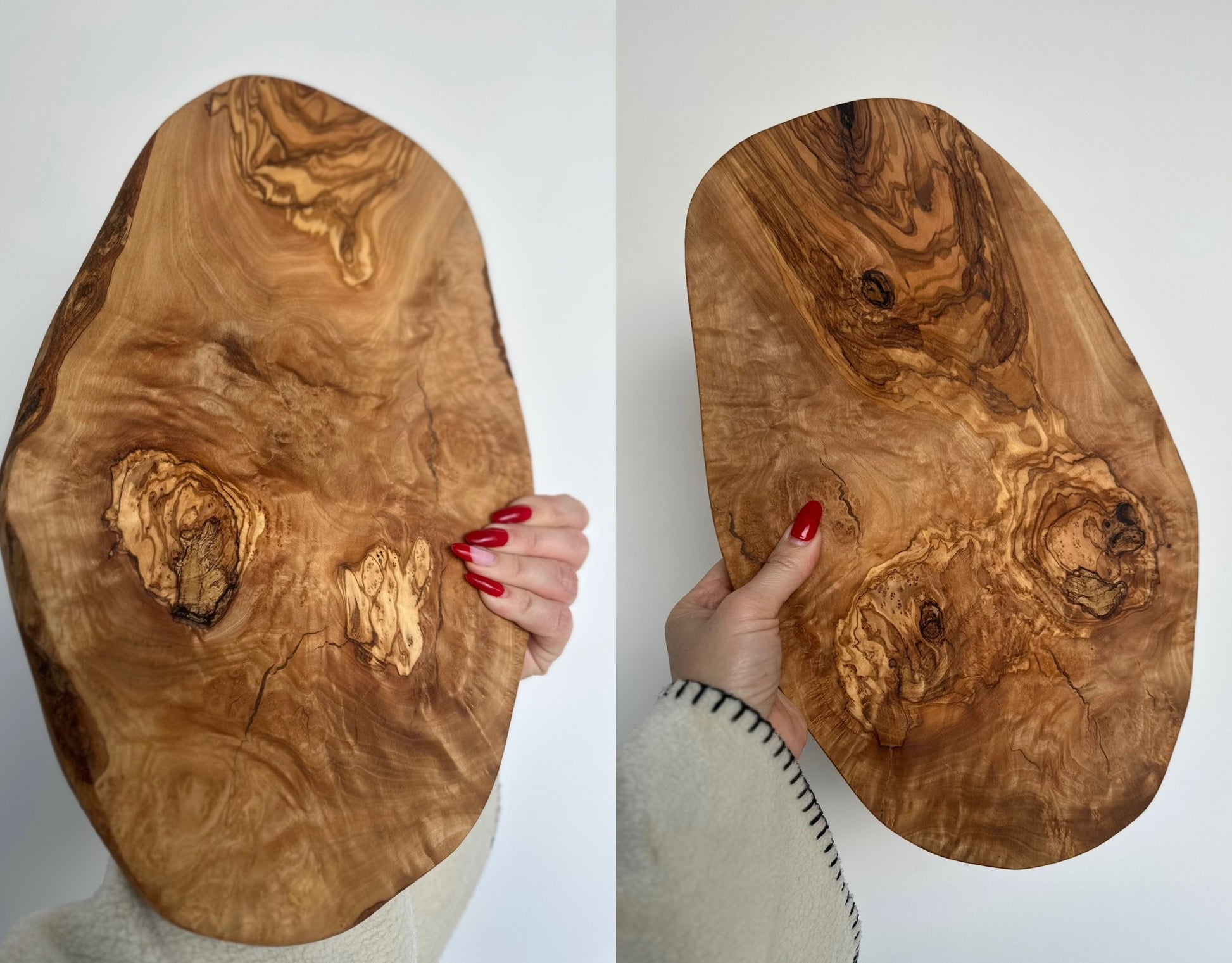 These stunning large olive wood boards now available in two larger sizes! The natural shape of this board means each one is unique. These olive wood boards can be used as cutting boards, cheese boards or serving boards.
