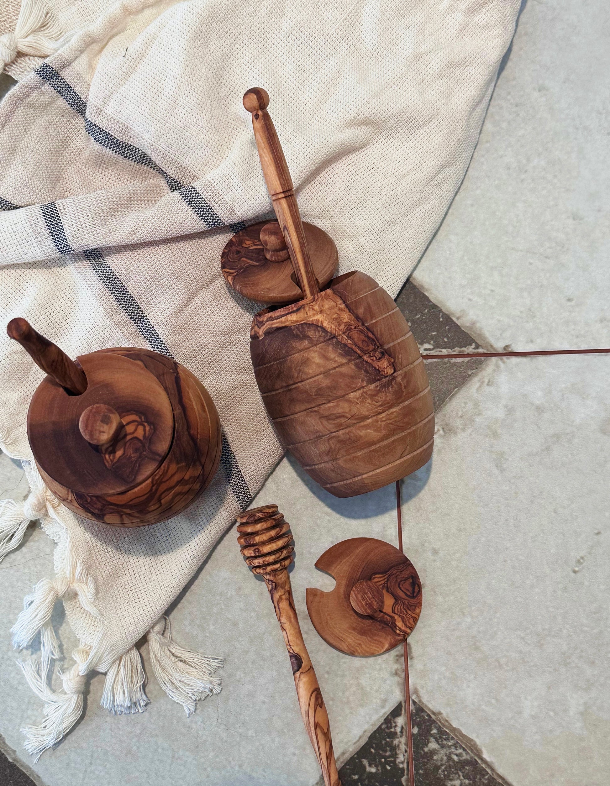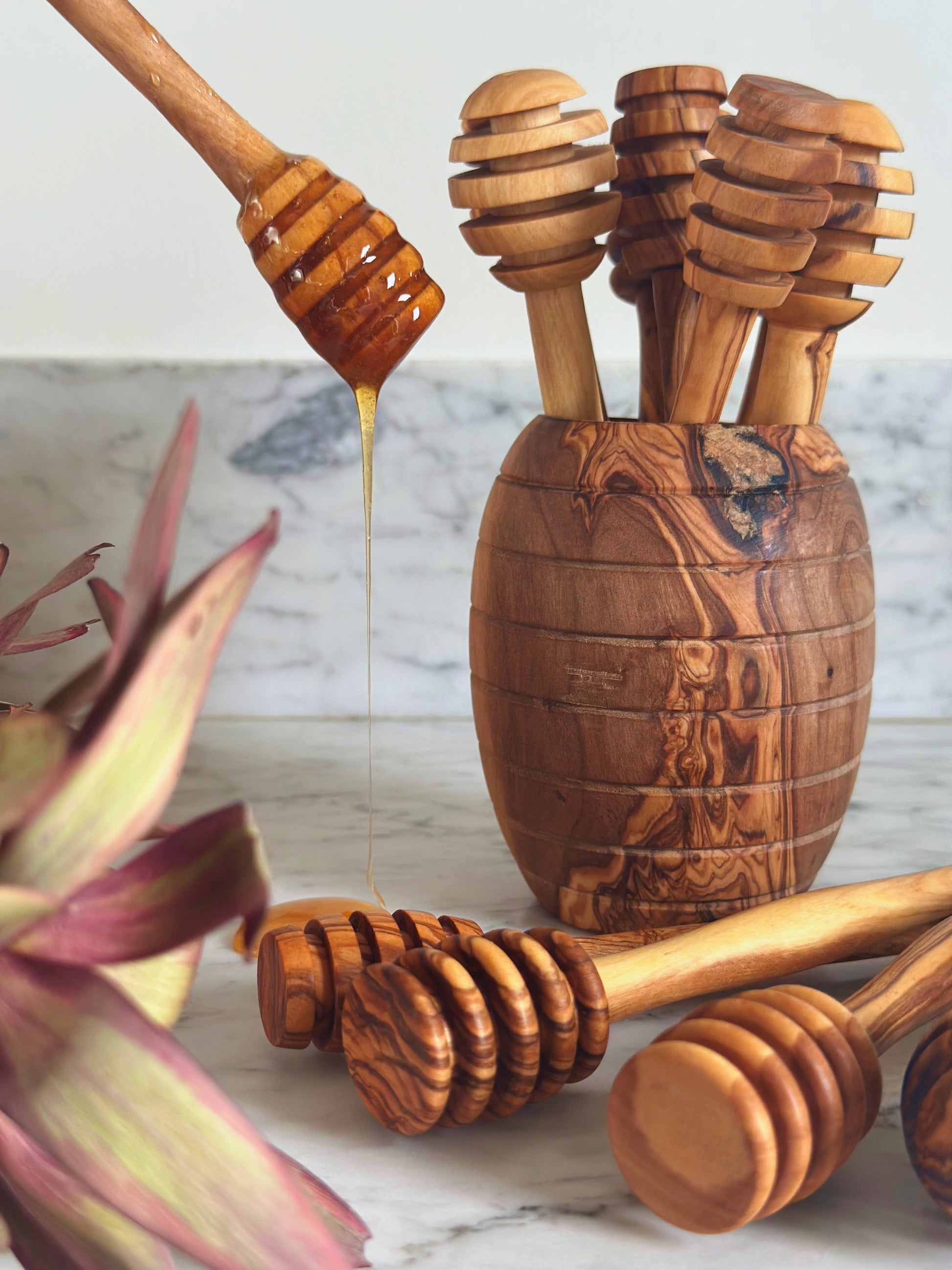 Our Olive Wood Honey Pot is the perfect way to store your honey! You can also store the dipper directly in the honey pot. This makes a darling addition to your counter & if you're entertaining, just add it to your cheese board, yogurt bar, & one of my favorites- pizza making party!