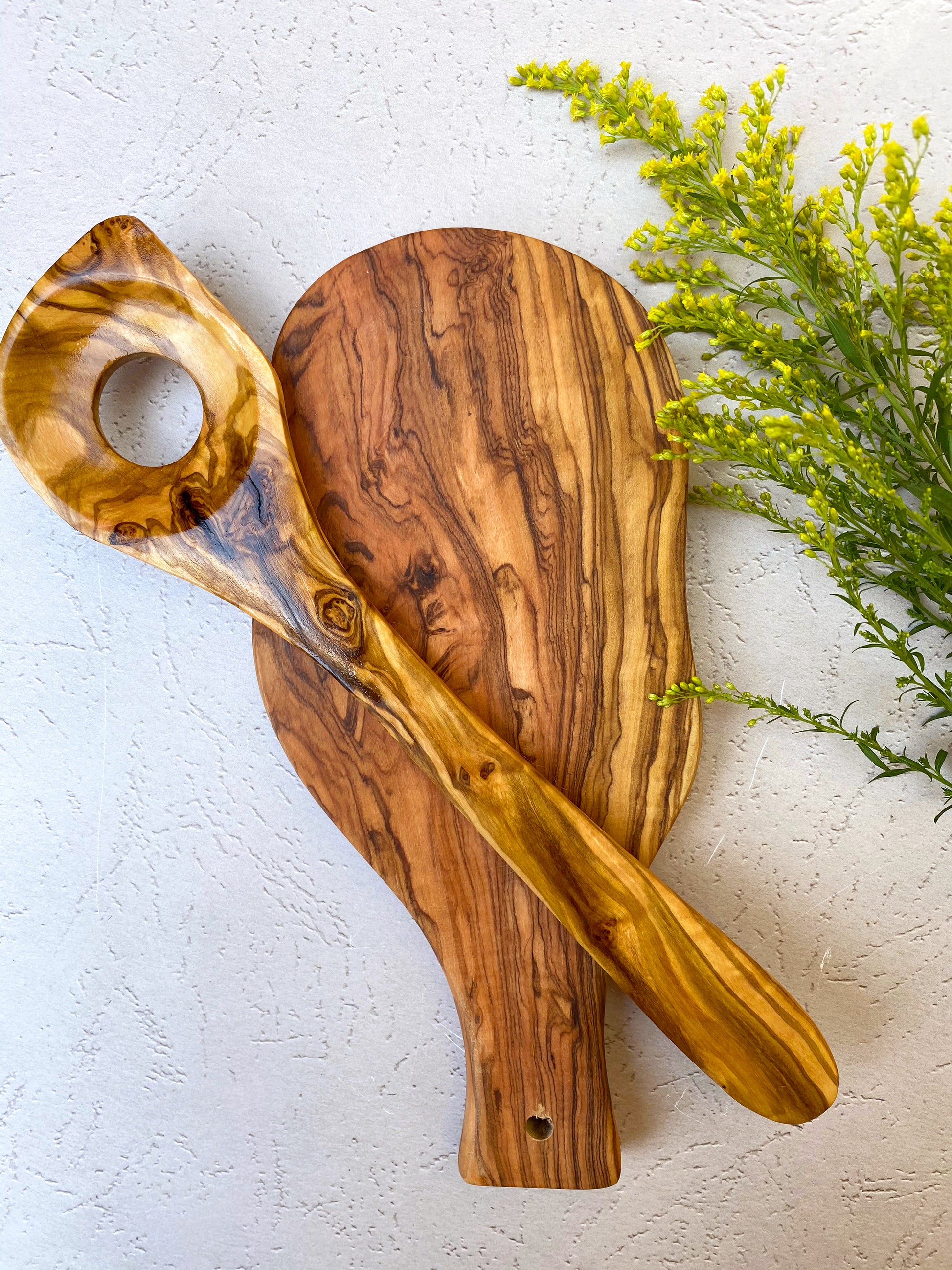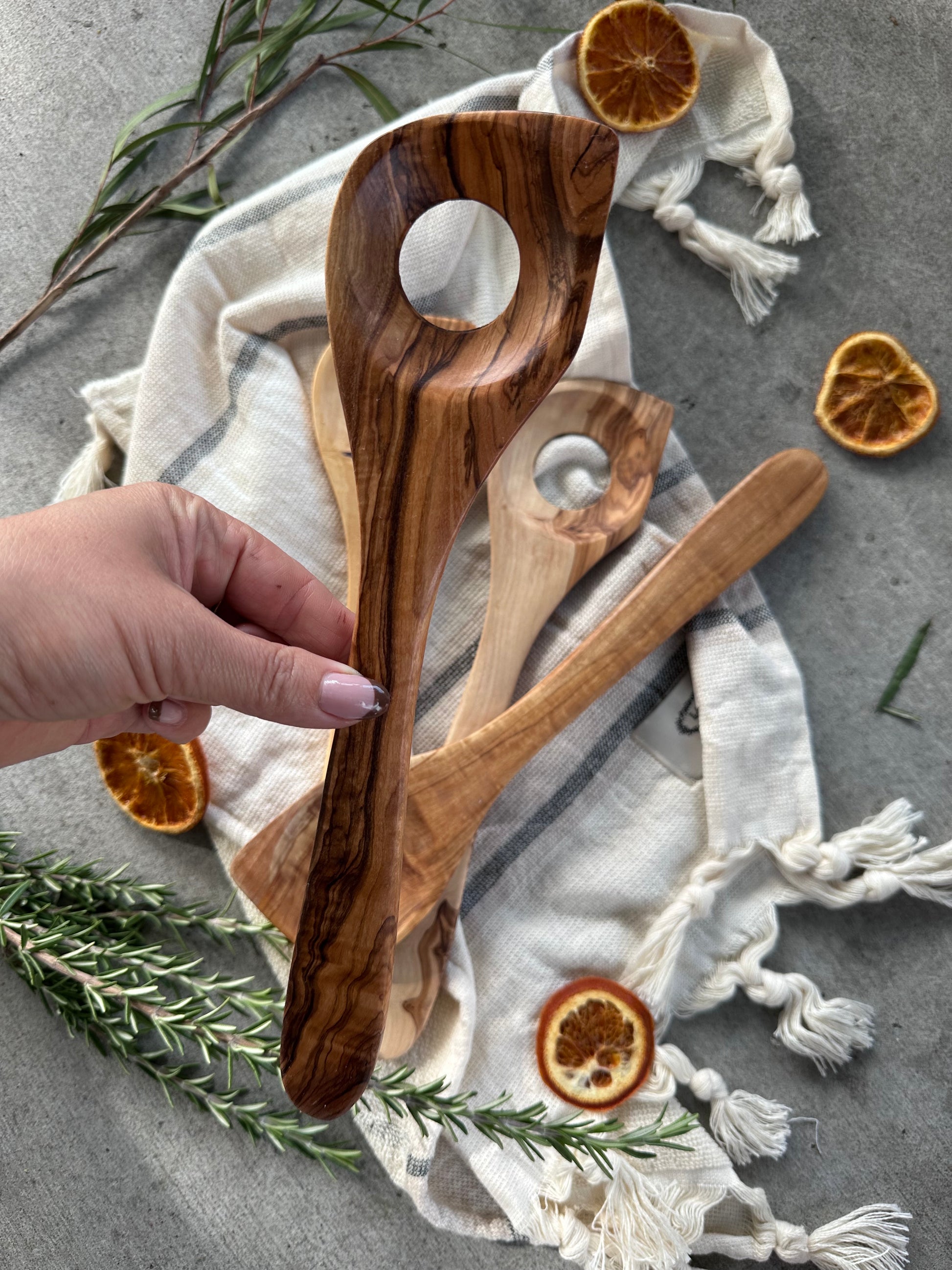 Our olive wood open spoon is perfect for stirrng all of your sauces, soups & stews, but works great for sauteting too! I also actually use the open hole to measure pasta. This style spoon is also called a risotto spoon, which means it's also perfect for serving risotto or any rice dish.