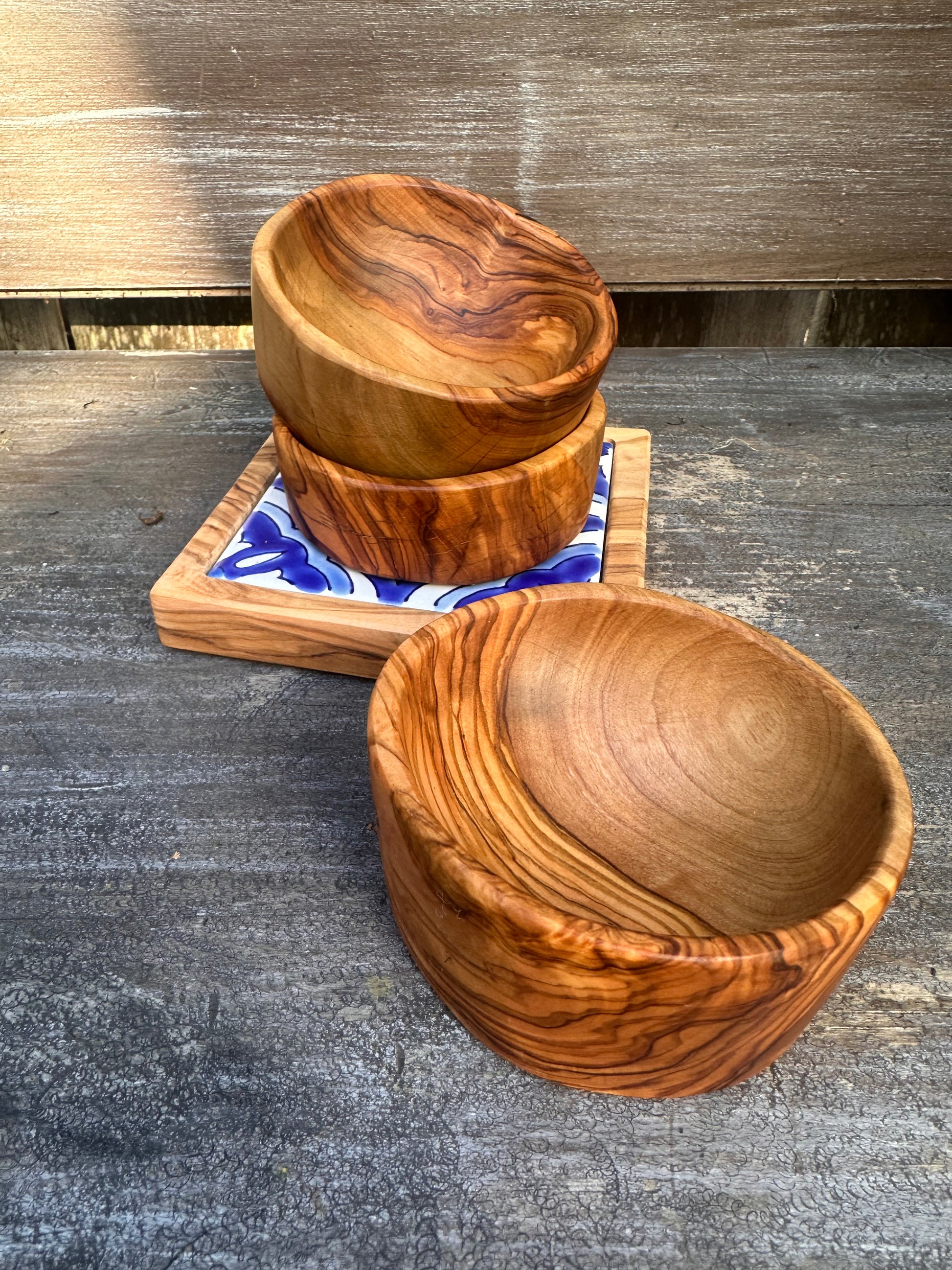 4'' x 4''// handcrafted in the Mediterranean from trees that are over 100 years old that no longer produce olives - shape & color may differ