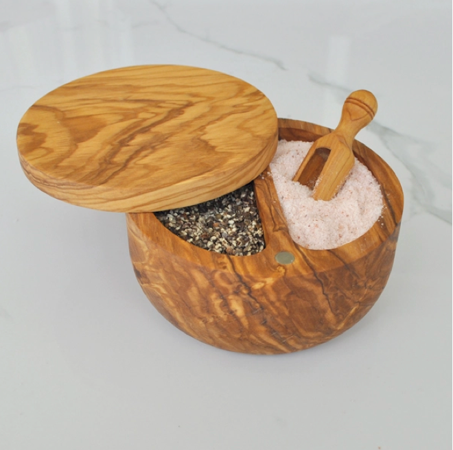 A stunning olive wood salt + pepper cellar. This salt and pepper pot has a pivoting lid that closes with a magnet. Use it as a pinch pot or combine it with our olive wood salt scoop!