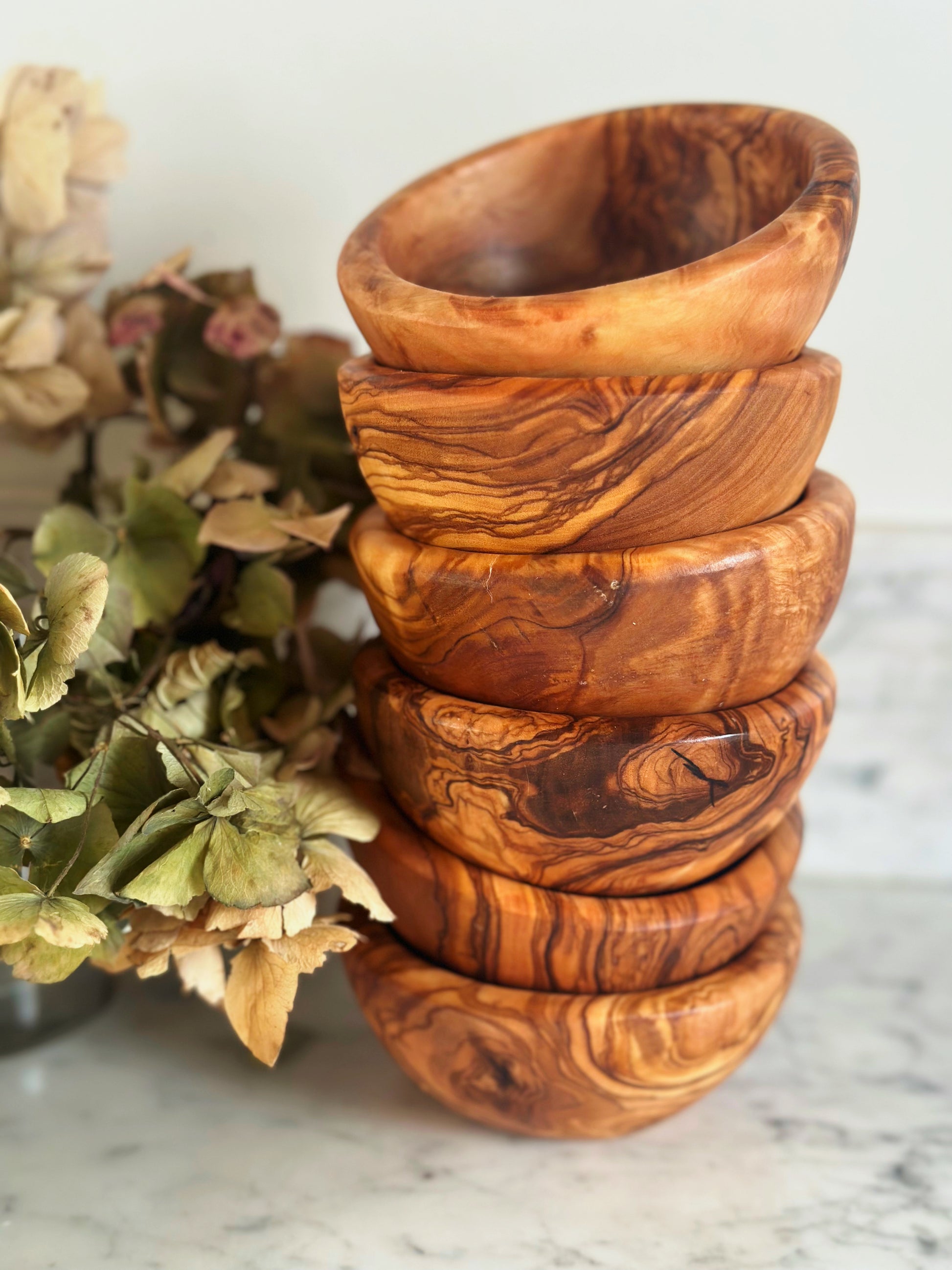 4'' // handcrafted in the Mediterranean from trees that are over 100 years old that no longer produce olives - shape & color may differ