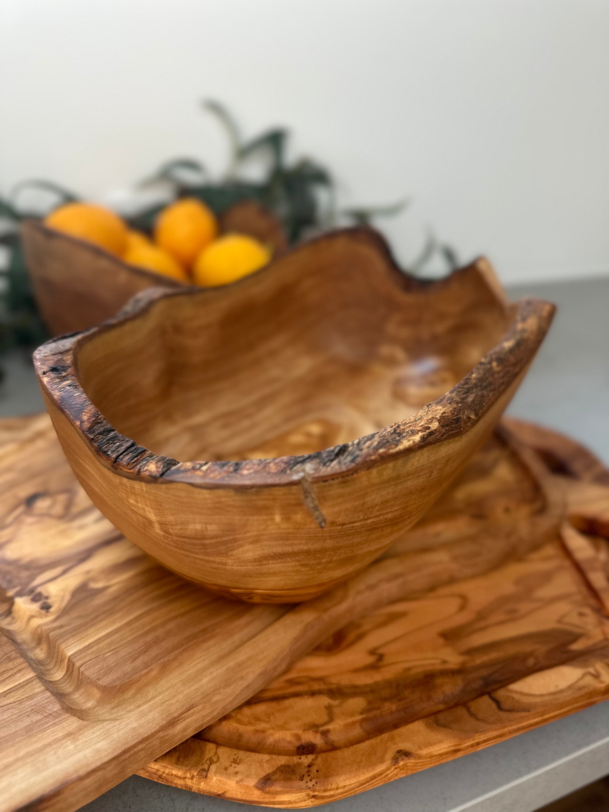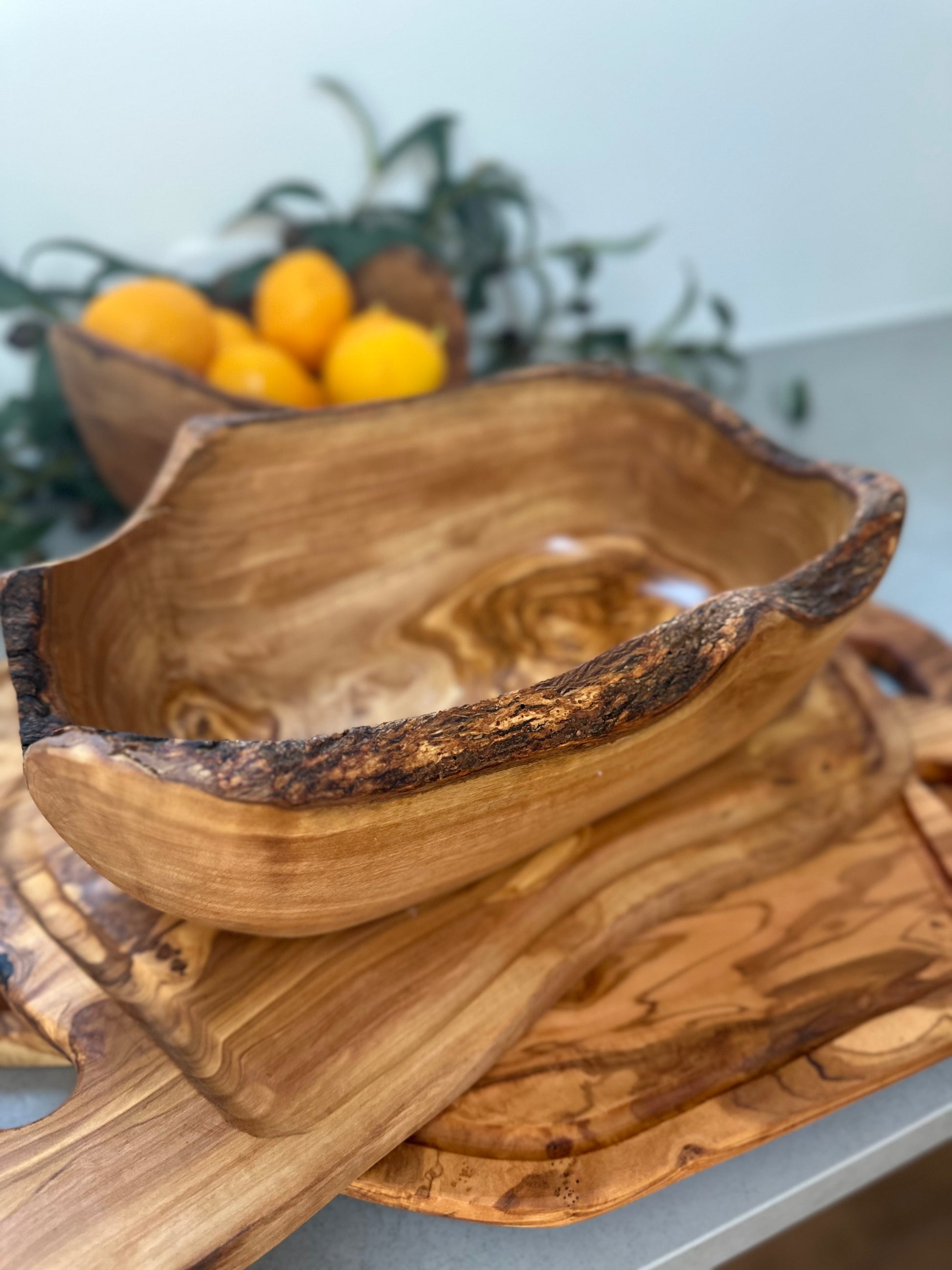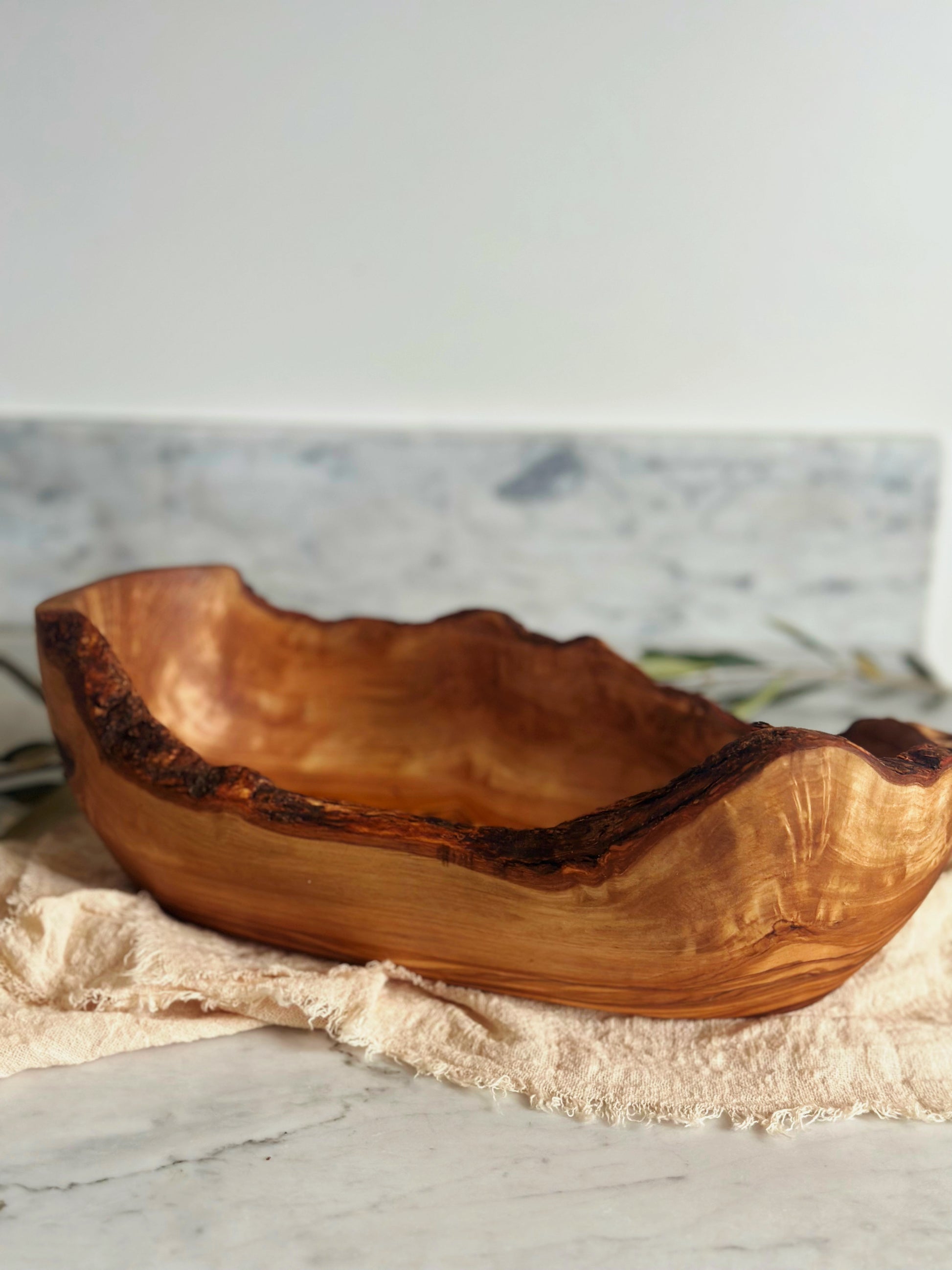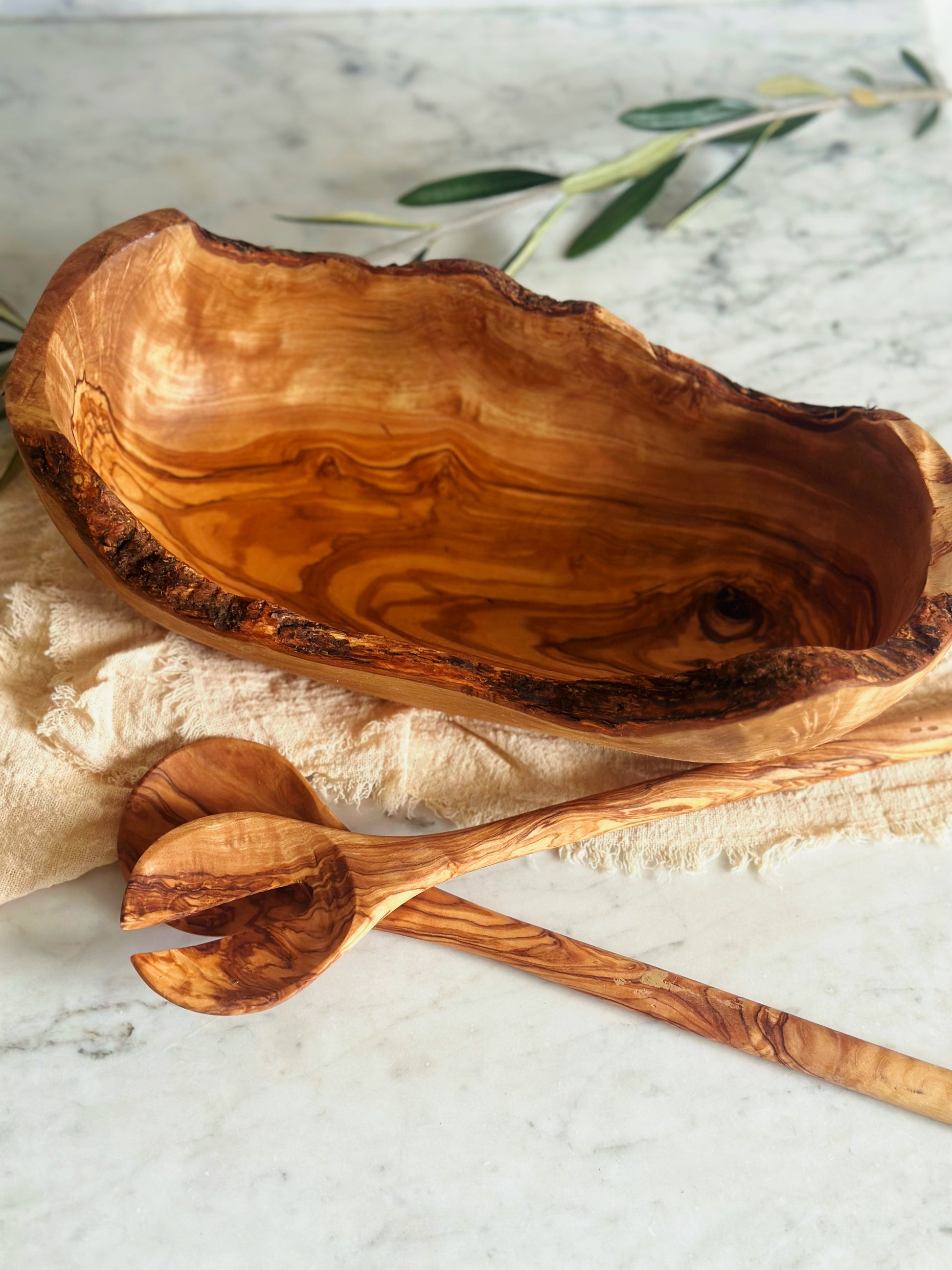 12'' or 14''// handcrafted in the Mediterranean from trees that are over 100 years old that no longer produce olives - shape & color may differ