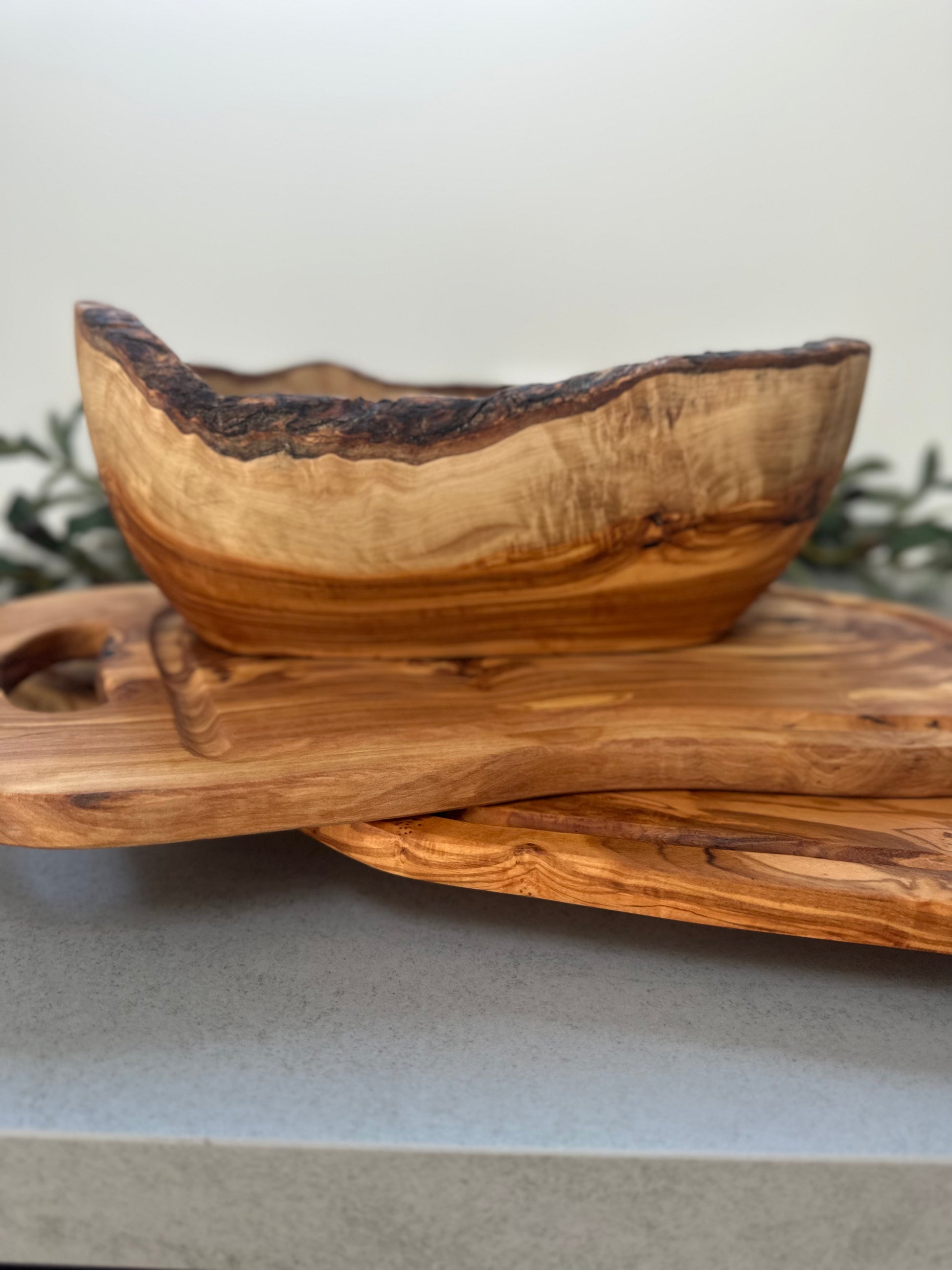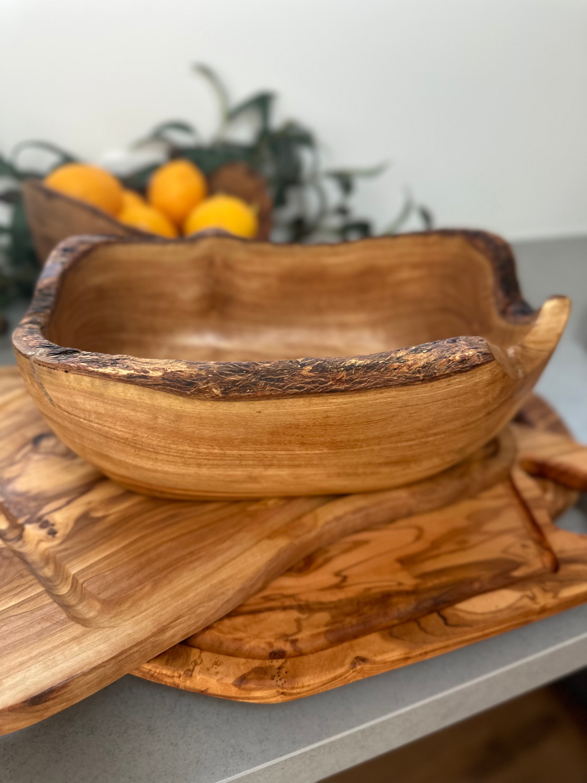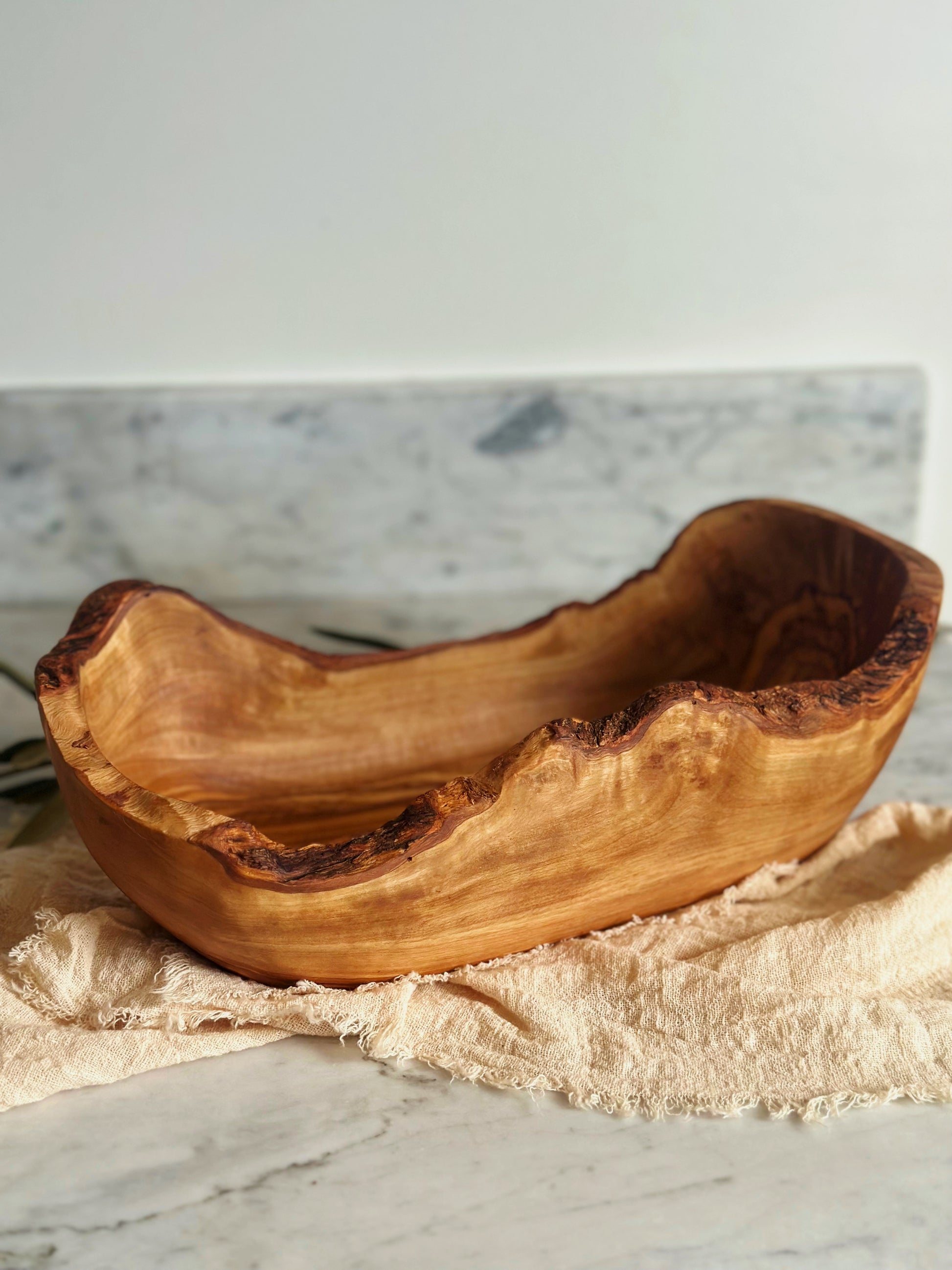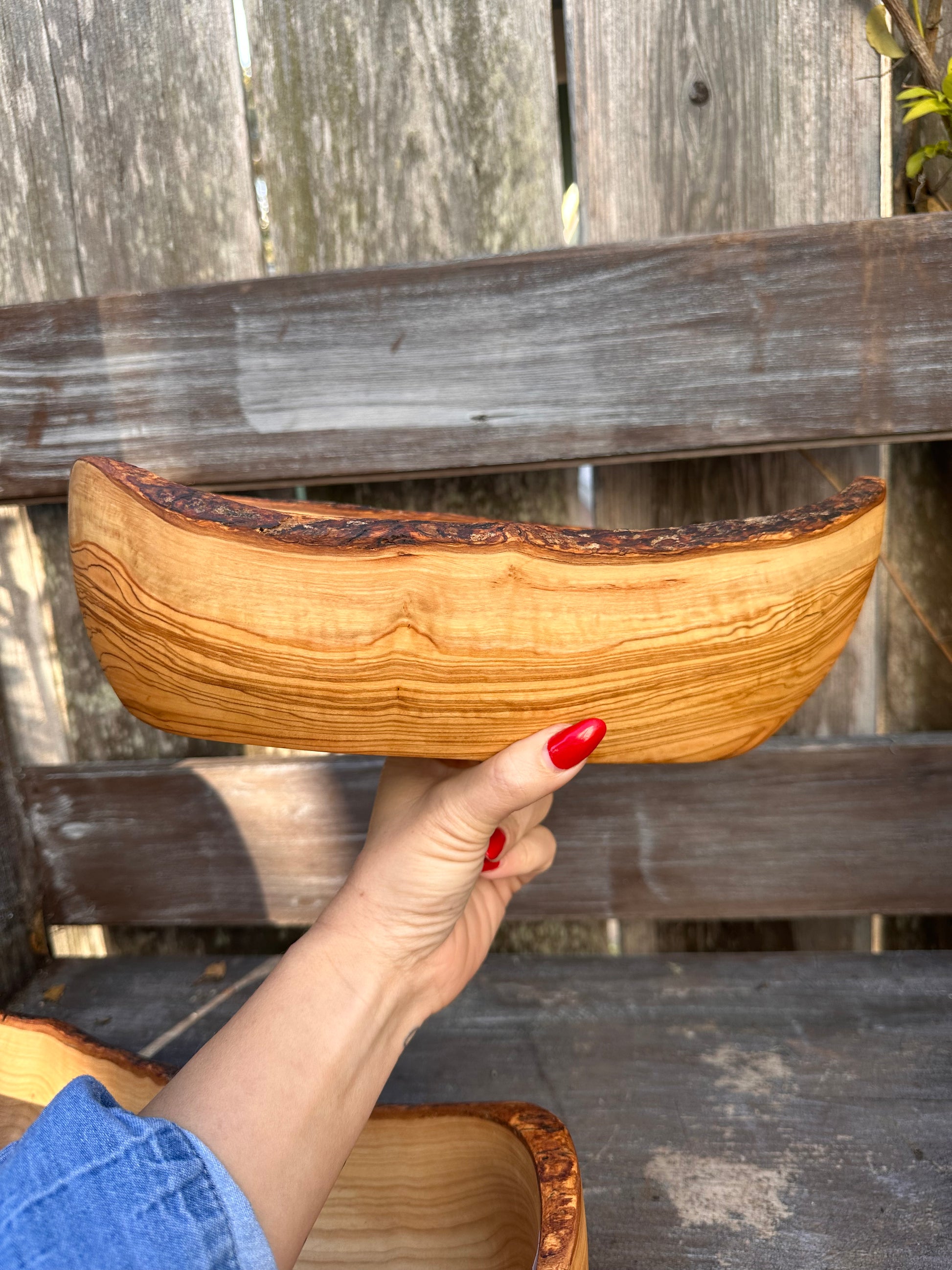 12'' or 14''// handcrafted in the Mediterranean from trees that are over 100 years old that no longer produce olives - shape & color may differ